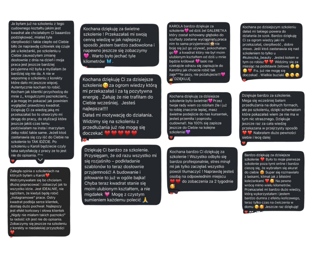 Zaufało mi już ponad 500 kursantek i przyjeżdżają do mnie z całej Polski– to właśnie u mnie dowiesz się, jak wykonać stylizację na najwyższym poziomie. Moje szkolenia to nie tylko teoria i schematy, które możesz znaleźć w internecie. To konkretna wiedza, setki trików i tajników, które sprawią, że Twoje prace będą ostre jak brzytwa i dopracowane do granic możliwości ❤